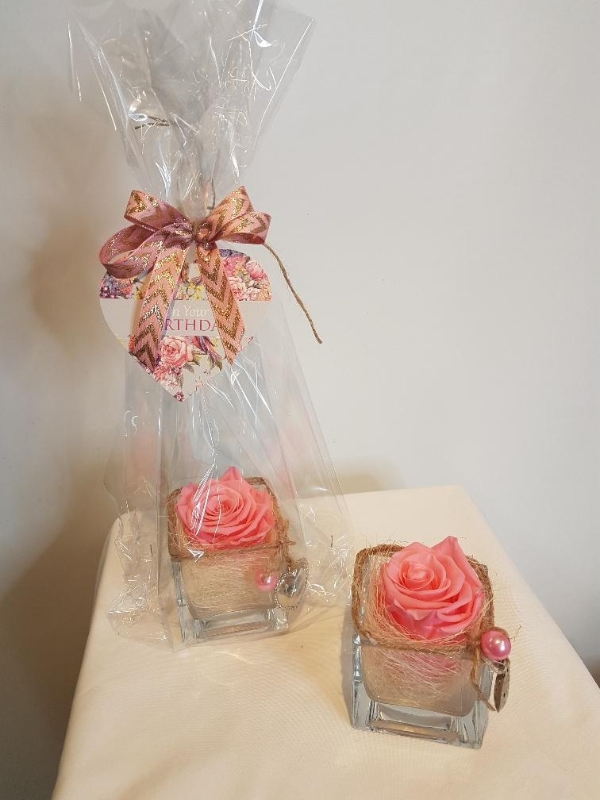Pink infinity rose in a clear vase wrapped in cello for delivery. No need to water .