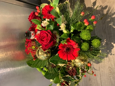 A beautiful arranged Reds and Golds christmas time bouquet with beautiful red rose , skimmia, holly, also xmas ferns. In a presentation box with water , care instructions  which will bring christmas cheer to any flower  customer home or office.