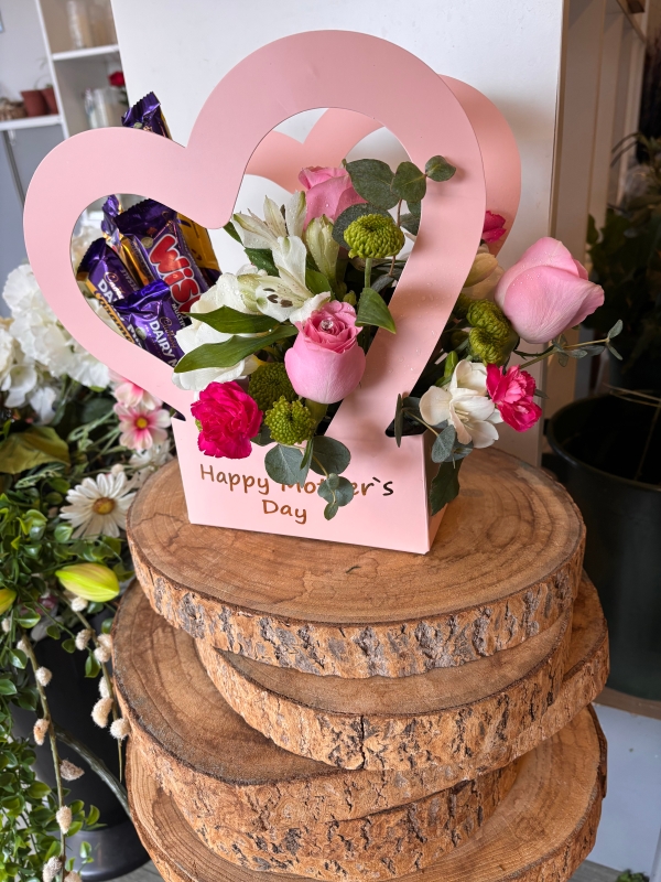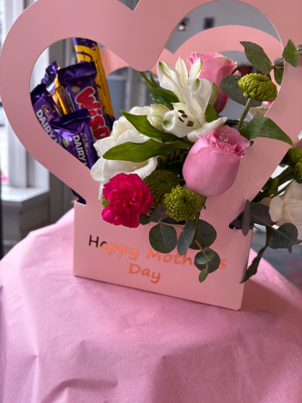 A  Beautiful Heart shaped Arrangement with a selection of pink roses, white freesia & spray carnations with added chocolates at the side.